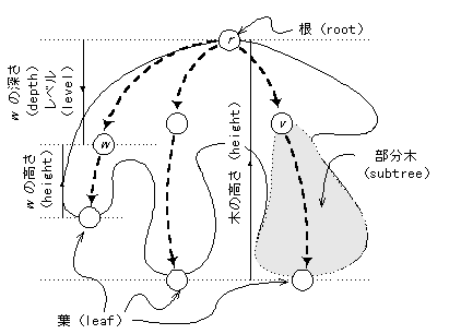 - 木の頂点 v の高さ(height)とは、v から最も遠い葉への有向道の長さである。